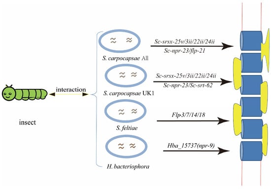 Entomopathogenic nematodes utilize relevant genes associated with GPCRs to communicate with their host by infecting host insects and releasing specific chemicals. GPCRs respond by transmitting signals through various expression pathways. Ultimately, the hosts succumb, providing essential nutrients for the growth and reproduction of entomopathogenic nematodes. These behaviors primarily involve the regulation of FLP family genes and other genes within entomopathogenic nematodes.