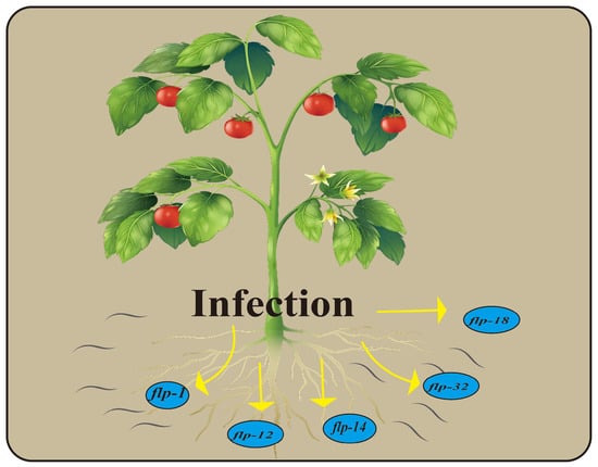 - Banakar, P.; Hada, A.; Papolu, P.K.; Rao, U. Simultaneous RNAi knockdown of three FMRFamide-Like peptide genes, Mi-flp1, Mi-flp12, and Mi-flp18 provides resistance to root-knot nematode, Meloidogyne incognita. Front. Microbiol. 2020, 11, 573916. [Google Scholar]