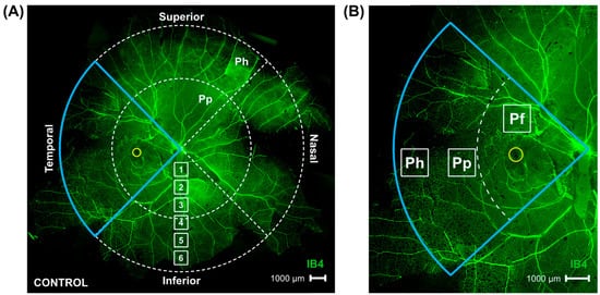 - Lin, C.; Toychiev, A.; Ablordeppey, R.; Slavi, N.; Srinivas, M.; Benavente-Perez, A. Myopia Alters the Structural Organization of the Retinal Vasculature, GFAP-Positive Glia, and Ganglion Cell Layer Thickness. Int. J. Mol. Sci. 2022, 23, 6202. [Google Scholar] [CrossRef]