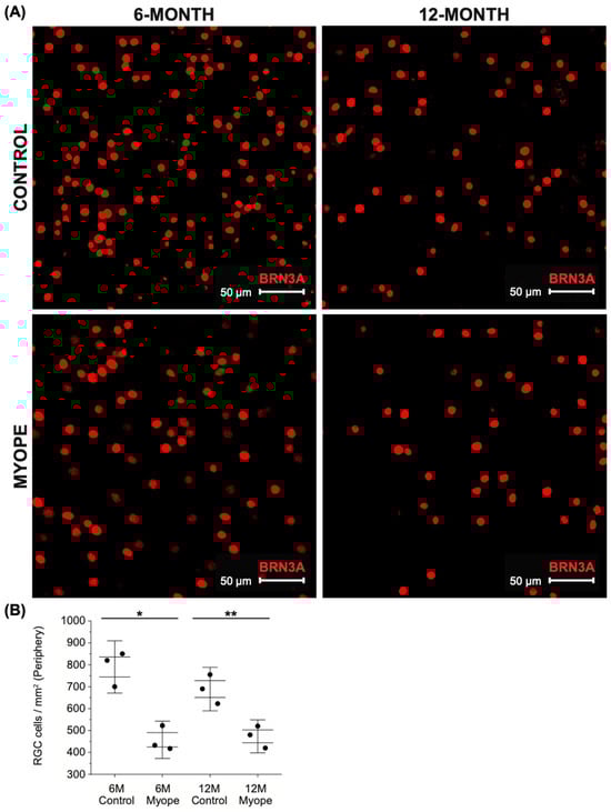 3.1. Pan-Retinal Ganglion Cell Density Decreases in Marmoset Eyes Induced with Myopia for 4 and 10 Months