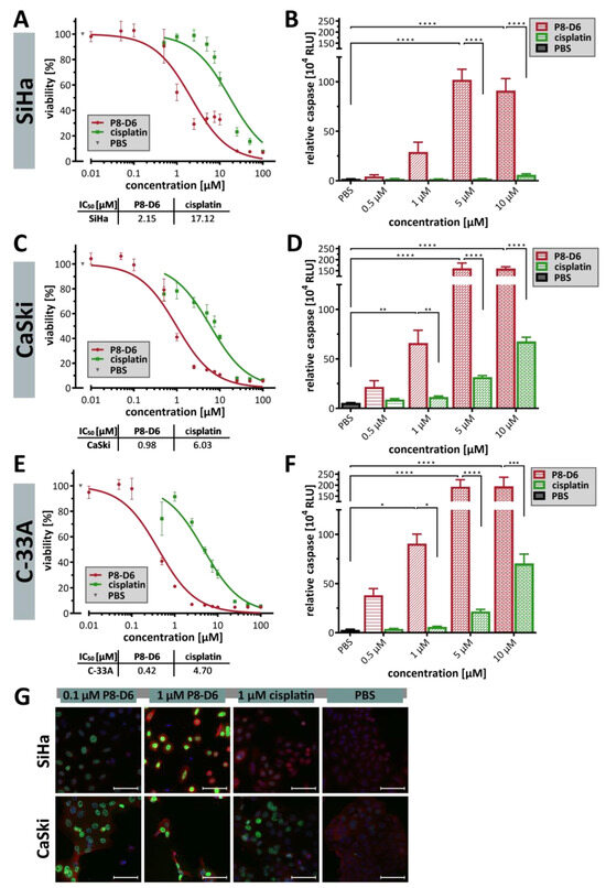 To investigate whether P8-D6 can lead to cell death in cervical carcinoma cells with more efficiency than the established therapeutic cisplatin, we analyzed the viability and apoptosis rate of several cervical carcinoma cell lines after 48 h of incubation with P8-D6 or cisplatin. Parameters such as the IC50 are often used to measure drug sensitivity. The viability analysis indicated that P8-D6 had stronger anti-proliferative properties against SiHa (IC50 = 2.15 µM) than cisplatin (IC50 = 17.12 µM) (Figure 1A). CaSki and C-33A cells were also more sensitive to P8-D6 than to cisplatin (Figure 1C,E). P8-D6 induced a significantly higher level of apoptosis in SiHa, CaSki and C-33A cells after 48 h than cisplatin and PBS (Figure 1B,D,F). Compared to topotecan, P8-D6 also induced significantly higher levels of apoptosis in SiHa cells (Figure S1). In terms of response, SiHa and CaSki were more resistant, while C-33A were more sensitive to P8-D6 and cisplatin therapy. In general, the HPV-independent tumors were more chemosensitive than the HPV-positive tumor cells. However, with an average 8.5-fold increase in efficacy compared to cisplatin therapy, P8-D6 showed a consistent improvement across all cell lines independent of HPV status.