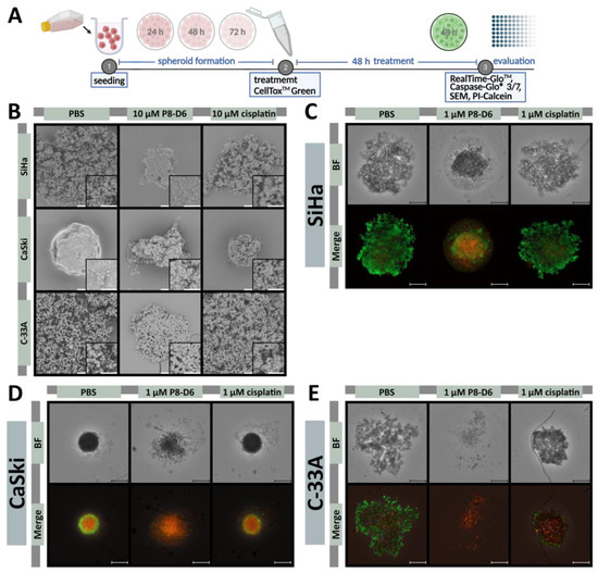 Since multicellular 3D tumor spheroids, as in vitro cell culture models, represent the in vivo situation more realistically than 2D models, the cell lines were cultivated in special 3D spheroid-forming ultra-low attachment plates. After spheroid formation, treatment was continued for an additional 48 h. Based on the 2D model experiments mentioned above, further staining and microscopic analyses were performed on the treated 3D cervical carcinoma spheroids to evaluate treatment efficacy (Figure 2A). Treatment with P8-D6 led to a change in the spheroid surface morphology. Aggregates, such as those formed by C-33A or SiHa cells, had more condensed structures after treatment with P8-D6 (Figure 2B). CaSki cells, which formed round spheroids without treatment, showed more indentations and a ruffled surface with a loss of membrane integrity by treatment with P8-D6. A considerable reduction in size was also the result of the treatment.