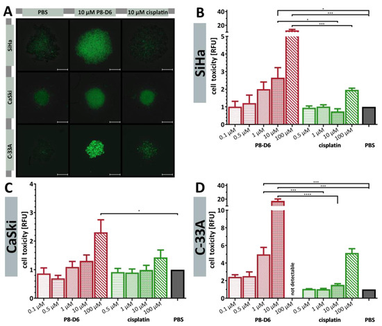 The P8-D6 treated spheroids almost exclusively showed a necrotic core and an intensive propidium iodide (PI) signal (Figure 2C–E). Different sensitivities with respect to P8-D6 treatment could be observed. Treating C-33A cells with 1 µM P8-D6 almost completely eliminated the spheroid (Figure 2E). Furthermore, the cytotoxicity to the cervical carcinoma spheroids was increased by P8-D6 treatment compared to cisplatin or PBS. In SiHa and C-33A spheroids, fluorescence signals were significantly higher after 48 h, while CaSki spheroids showed a large necrotic core even without treatment (Figure 3). P8-D6 treatment reduced viability by >18-fold compared to cisplatin (Figure 4). P8-D6 also significantly increased apoptosis in cervical carcinoma spheroids.
