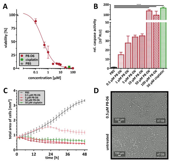 Antitumor effect of P8-D6 in primary cervical carcinoma cells. Primary cells were treated in a 2D monolayer cell culture with P8-D6, cisplatin and PBS in single therapy for 48 h. After treatment, the viability (A) and caspase activity (B) were measured. Data are means + SEM with analysis by one-way ANOVA, **** (p < 0.0001). (C) The total area of cells was determined over time. Data are means + SEM. (D) Cell growth videos showing the effects of treatment with P8-D6 after nearly 48 h compared to untreated controls; scale bars, 100 μm.