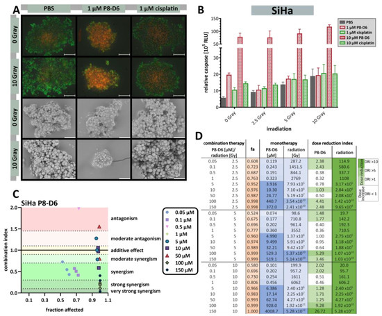 Antitumor responses to combined treatment with radiotherapy and P8-D6 in 3D SiHa cell culture models. SiHa spheroids were maintained in ultra-low attachment plates for 72 h, irradiated with a total dose of 2.5 Gy, 5 Gy or 10 Gy and immediately treated for 48 h with P8-D6, cisplatin or PBS. (A, top) After treatment, SiHa spheroids were live/dead co-stained with PI (red) and calcein-AM (green) and imaged by fluorescence microscopy; scale bars, 500 μm. (A, bottom) Scanning electron microscope images were taken of the spheroids treated with radiochemotherapy; scale bars, 50 μm. (B) Viability and caspase activity of the SiHa spheroids were measured after treatment (relative luminescence units, RLU). (C) Combination index (CI) for combining radiotherapy with P8-D6 was determined using the SiHa spheroids. CI values were calculated by CompuSyn 1.0 software (ComboSyn Inc.; Cambridge, UK) using the fraction affected (fa)-value. The fa-value represents the fraction of cell viability affected by therapy. fa color scalar (0 (white)-1 (light brown)) Combinations were considered synergistic when CIs were below 1.0. (D) The monotherapy column defines the concentrations that are needed in monotherapy to affect a certain fraction of cells by therapy. The increasing blue color intensity classifies the concentration required to achieve the same effect. The more treatment required, the more intense the blue color. DRI values represent the order of magnitude (fold) of dose reduction in a combination setting compared with each drug alone.
