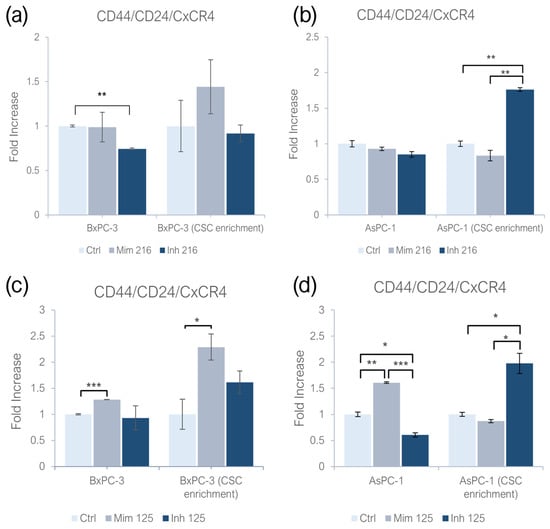 Mimicking the miR-216a-5p effect, both adherent BxPC-3 and AsPC-1 showed no significant changes in CD44/CD24/CxCR4 expression; while inhibiting it, the expression of CSC markers in BxPC-3 was significantly reduced in comparison with the controls (p < 0.01). No statistical significant changes were detected on adherent AsPC-1. Investigating the role of this molecule on CSC-like models of BxPC-3, no significant changes were found. In AsPC-1 CSC-like models treated with miR-216a-5p inhibitor, the expression of PaCSC markers increased (p < 0.01), while no statistically significant changes were detected following the treatment with the miR-216a-5p mimic (Figure 1a,b). When treating monolayer-grown cell lines with the miR-125a-5p mimic, CD44/CD24/CxCR4 expression increased in both BxPC-3 (p < 0.001) and AsPC-1 (p < 0.01). Inhibiting miR-125a-5p, the expression of CD44/CD24/CxCR4 decreased in AsPC-1 (p < 0.05), while non-statistically significant differences were found on BxPC-3. In BxPC-3 CSC-like models, the effect of miR-125a-5p resulted in an increased expression of PaCSC markers (p < 0.05). When treating the same models with the miR-125a-5p inhibitor, no statistically significant changes were detected. In AsPC-1 CSC-like models, the treatment with the miR-125a-5p mimic did not induce statistically significant changes, while the inhibition of the molecule produced an increased expression of CD44/CD24/CxCR4 (p < 0.05) (Figure 1c,d).