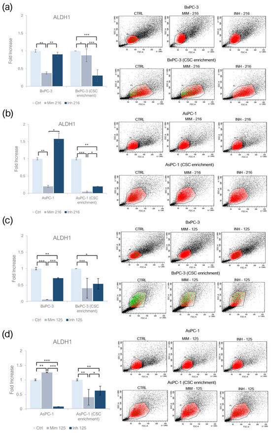 Effect of miR-216a-5p on ALDH1 activity and representative flow cytometry cytogram plot of (a) adherent BxPC-3 and their CSC-like models; and (b) adherent AsPC-1 and their CSC-like models. Effect of miR-125a-5p on ALDH1 activity and representative flow cytometry cytogram plot in (c) adherent BxPC-3 and their CSC-like models; and (d) adherent AsPC-1 and their CSC-like models. x-axis: FSC-A/ALDH1, y-axis: SSC-A/side scatter. Red dots refer to the entire population while green dots are representatives of ALDH1+ population. Values were normalized with the control cells in monolayer and in CSC enrichment. We attributed different p-values to the asterisks: * p < 0.05; ** p < 0.01; *** p < 0.001.