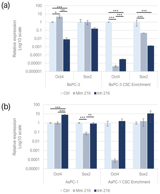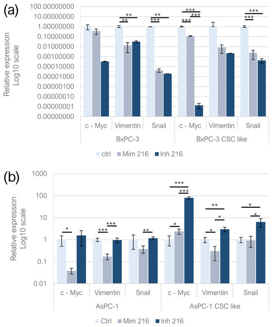 EMT-related gene expression following miR-216a-5p mimic and inhibitor transfection in (a) adherent BxPC-3 and CSC-like models and (b) in adherent AsPC-1 and their CSC-like models. We attributed different p-values to the asterisks: * p < 0.05; ** p < 0.01; *** p < 0.001.