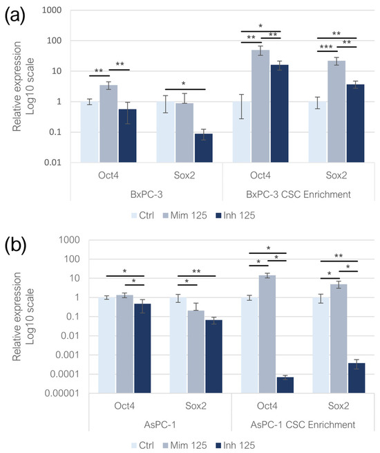 In adherent BxPC-3 transfected with the miR-125a-5p mimic, the expression of Oct-4 increased compared to the control group (p < 0.01), while, in the treatment with the inhibitor, non-statistical significant changes were detected. In the inhibitor-treated adherent AsPC-1, Oct-4 expression was reduced (p < 0.05). No statistically significant change was found in AspC-1 treated with the miR-125a-5p mimic (Figure 4a,b). In adherent AsPC-1, the treatment with the miR-125a-5p mimic induced a decrease in Sox-2 expression (p < 0.05). The same effect was detected following the inhibitor treatments in monolayer-grown BxPC-3 (p < 0.05) and AsPC-1 cell lines (p < 0.01). In CSC-like models built on BxPC-3, both treatments resulted in the overexpression of Oct-4 (p < 0.01): the overexpression was higher following the treatment with the miR-125a-5p mimic (p < 0.05). Enhancing the miR-125a-5p effect, CSC-derived from AsPC-1 exhibited an increase in Oct-4 expression (p < 0.05), while the inhibition of the miRNA induced a decrease in Oct-4 levels (p < 0.05). In both BxPC-3- (p < 0.001) and AsPC-1 (p < 0.05)-derived CSC-like models, Sox-2 was overexpressed in the mimic condition. MiR-125a-5p inhibition resulted in the overexpression of Sox-2 in BxPC-3 CSC-like models (p < 0.01) and in the downregulation of the gene in CSC-enriched AsPC-1 (p < 0.01) (Figure 4a,b).