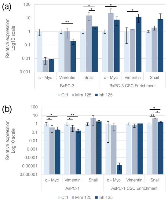 EMT-related gene expression following miR-125a-5p mimic and inhibitor transfection in (a) adherent BxPC-3 and CSC-like models and (b) AsPC-1 and CSC-like models. We attributed different p-values to the asterisks: * p < 0.05; ** p < 0.01.