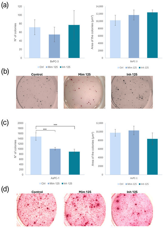 Enhancing the miR-125a-5p effect on BxPC-3 CSC-like models, the number and the area of the colonies did not exhibit statistically significant changes. In AsPC-1 CSC-like models, the treatment with the miR-125a-5p mimic resulted in fewer colonies compared to the controls (p < 0.001). The same behavior was observed following the treatment with the miR-125a-5p inhibitor (p < 0.001). No statistically significant variations were reported in the area of the colonies, following both the mimic and inhibitor treatments (Figure 8).