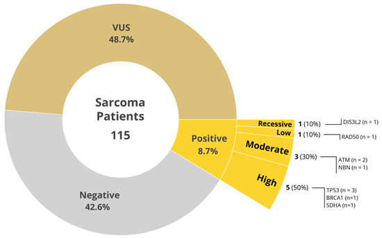 Sarcomas are a heterogeneous group of tumors stemming from mesenchymal tissue. They comprise approximately 1% of adult yet 15% of child malignancies, lending credence to a possible genetic predisposition to sarcomas [1]. The annual incidence of soft tissue sarcoma is about 15,000–16,000/yr. in the United States [2]. Sarcomas are very heterogenous, with over seventy-five different histologic subtypes which have different clinical and histological characteristics [3]. There are known, well-established, genetic cancer syndromes that involve sarcoma including in Li–Fraumeni syndrome (TP53) and Carney–Stratakis syndrome (SDHB, SDHC, SDHD), among other syndromes [4,5,6]. The mainstay of sarcoma treatment is surgical resection and radiotherapy with approved systemic therapies including chemotherapy and targeted treatments, which have shown improvement in progression-free survival and, in some instances, overall survival.