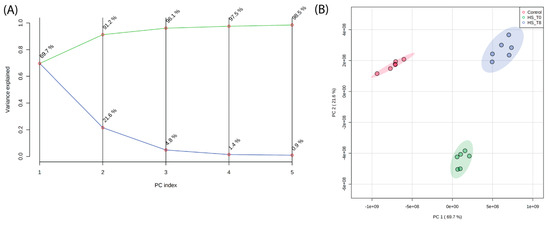 Principal Component Analysis (PCA) of transcriptomic profiles in response to heat shock. (A) A scree plot displays the proportion of variance explained by the first five principal components (PCs). The first two PCs capture the majority of transcriptomic variance, with PC1 contributing the most. (B) PCA score plot showing distinct clustering of experimental groups. R0 (red) samples diverge significantly from control (blue) along PC1 (43.32% variance explained), indicating a strong immediate transcriptional response to heat shock. R8 (green) samples shift back toward the control group along PC1 and PC2 (22.45% variance explained), suggesting a partial recovery of transcriptomic profiles after 8 h.