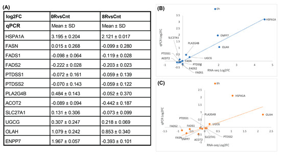 qPCR validation of lipid metabolism genes. (A) Quantitative panel summarizing the mean log2 fold change (log2FC) and standard deviation (SD) of selected lipid metabolism-related genes measured by qPCR for 0RvsCnt and 8RvsCnt comparisons. Most lipid-related genes exhibit minimal transcriptional changes, aligning with RNA-seq findings. (B,C) Scatter plots comparing log2FC values obtained from RNA-seq and qPCR for the 0 h ((B), blue) and 8 h ((C), orange) conditions. A strong correlation is observed for HSPA1A, confirming heat shock-induced upregulation. the dotted line represents a linear regression.