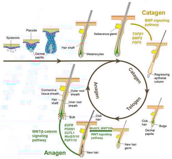 The hair cycle growth goes through anagen, catagen, and telogen. Each period is regulated by different signaling pathways, including WNT and BMP signaling pathways. Starting with the initial postnatal anagen, when the hair shaft begins to grow and poking through the skin’s surface, the stages of the hair cycle are shown. Apoptosis and regress occur in the lower two-thirds of follicles during the destructive (catagen) phase, which occurs simultaneously in follicle progression. When a critical threshold of activating factors is achieved, the dermal papilla is brought to rest below the bulge stem cell compartment, and the stem cells are triggered to regenerate hair after the resting (telogen) phase.