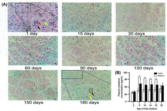 (A) Morphological changes in PHF and SHF in cashmere goat kids from 0 to 180 days. Skin samples were fixed in 4% paraformaldehyde, sectioned, and stained using the Sacpic method (Safranin O and Picric acid). Images were acquired under a light microscope (Nikon Eclipse E100, 40× magnification). PHF (black arrow), immature SHF (red arrow), and mature SHF (yellow arrow) are indicated [99]. (B) Serum melatonin levels (pg/mL) during postnatal development [7], * p < 0.05.