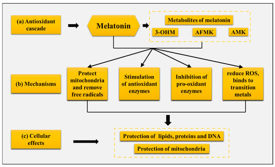 Melatonin initially and primarily mainly served as a free radical scavenger and antioxidant in cyanobacteria roughly 3.5 to 3.2 billion years ago, neutralizing harmful oxygen compounds created during photosynthesis [116]. Over the next 3 billion years of melatonin evolution, its chemical structure has never changed, and the melatonin in cyanobacteria is structurally identical to that present in mammals today, with its original antioxidant function preserved [117,118]. Melatonin is very effective in reducing oxidative stress, it is highly soluble in lipids and partially soluble in water, and acts as an antioxidant in intracellular, body fluids, the aqueous environment of cell membranes and organelles [119,120]. Melatonin’s ability to cross physiological barriers and rapidly enter cells means that it is considered to be an ideal broad-spectrum antioxidant [121,122]: (a) it protects lipids, proteins, and DNA from oxidative damage [123,124,125], (b) it is highly concentrated in regions where free radicals are formed, such as in mitochondria, and melatonin synthesis is stimulated in the mitochondria [126,127], (c) both melatonin and its metabolites have a free radical scavenging function [128], (d) melatonin is also involved chelating cascade with metals, thereby reducing the formation of the aggressive reactive oxygen species (ROS) [129], and (e) melatonin induces the stimulation of the activity of some antioxidant enzymes [130] (Figure 5).
