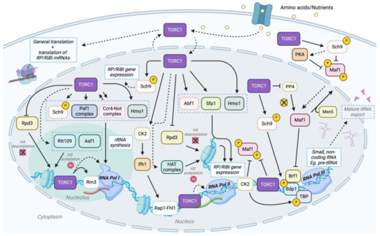 In yeast, about half of all RNA Pol II-mediated transcription is devoted to the production of ribosomal proteins to modulate ribosome biogenesis [186]. As previously discussed, TOR influences the expression of RNA Pol II-transcribed genes by affecting the nuclear/cytoplasmic localization of TFs through phosphorylation events. This portion of the review discusses genes of ribosomal proteins (RP) and ribosomal biogenesis (RiBi). In yeast, these genes are regulated by TOR via different mechanisms that directly or indirectly influence RNA Pol II activity. In contrast, mTORC1 regulates ribosomal protein gene expression mainly at the translational level [8]. mTORC1 promotes the translation of all ribosomal protein mRNAs [179]. In budding yeast, transcription factor Rap1 is a key player for both genes of ribosomal proteins and ribosomal biogenesis [212]. It binds to most ribosomal protein gene promoters and, thus, approximately half of all RNA Pol II transcripts [212]. Rap1 recruits a second transcription factor, Fhl1. Fhl1 is regulated by the coactivator Ifh1 and the corepressor Crf1 [71,213]. Under normal conditions, TORC1 keeps Crf1 within the cytoplasm via negative regulation of the kinase Yak1, preventing its interaction with Fhl1 and allowing the Rap1–Fhl1 complex to drive ribosomal protein gene expression [214]. Upon TORC1 inhibition, either through nutrient availability or otherwise rapamycin treatment, Yak1 can phosphorylate Crf1, and Crf1 can be transported to the nucleus and interfere with the Fhl1–Rap1 complex by interfering with Ifh1, leading to the downregulation of ribosomal protein gene expression [215]. In a recent study, CK2, another known TORC1 downstream effector, can also phosphorylate both Crf1 and Ifh1, vital in ribosome protein gene promoter binding [216].