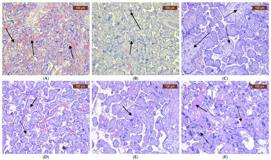 Figure 1. Histopathological changes in the placenta from women with vaginal infection. (A) E. coli infection. Areas of hemorrhage in the villous and intervillous space (black arrows) (HE×10). (B) Klebsiella infection—cytotrophoblast layer showing large, irregular, and hyperchromatic nuclei with more eosinophilic or amphophilic cytoplasm (black arrows) (HE×10). (C) GBS infection—the villous space is loose and edematous, with many fetal blood vessels and rare cells (black arrows) (HE×20). (D) Enterococcus faecalis infection—the villous space is dens with less vessels and rare cells (black arrows) (HE×10). (E) Candida spp. Infection—membrane infiltration (black arrows) (HE×10). (F) Ureaplasma urealyticum infection—placental fibrinoid and lymphocytic infiltration (black arrow) (black arrows) (HE×10).