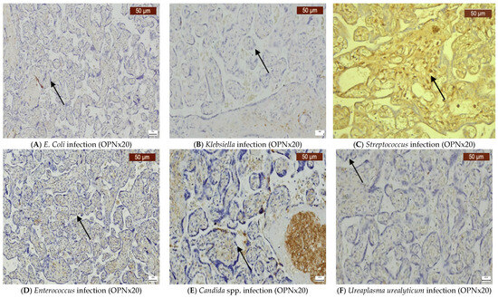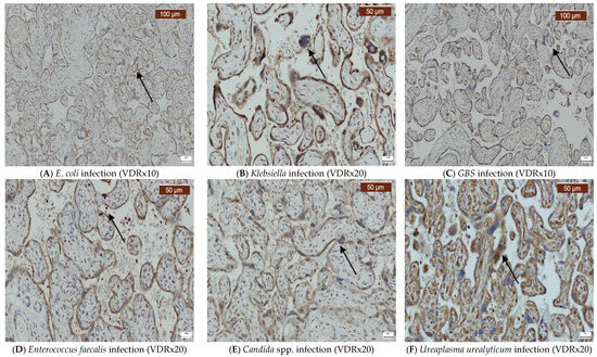 The histological characteristics of the placenta varied according to the infections caused by the isolated pathogens (Figure 1A–F). In E. coli infections, there was damage to the placental villi, including areas of necrosis, significant inflammation, and occasional thrombi within the chorionic vessels (Figure 1A). Klebsiella infections also showed destruction of the chorionic villi, accompanied by fibrosis and more active and intensive inflammatory response (Figure 1B). GBS infections led to inflammatory infiltrates of neutrophils in the fetal membranes (amnion and chorion), fetal blood vessels within the chorionic plate, stem villi, and chorionic villi (Figure 1C). The presence of Enterococcus faecalis resulted in membrane infiltration and occasionally affected the villi, with small clots in the placental vessels, which impaired blood flow (Figure 1D). Candida spp. infections were characterized by noticeable lymphocytic infiltration (Figure 1E). In Ureaplasma urealyticum infections, there was less severe neutrophilic infiltration of the membranes, along with prominent lymphocytic infiltration, syncytial knots, and intervillous fibrin (Figure 1F); in some cases, small thrombi in the chorionic vessels were observed, resulting from extensive inflammation and vascular injury.