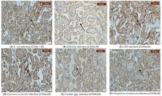 Infections caused by E. coli, Klebsiella, GBS, Enterococcus faecalis, Candida spp., and Ureaplasma urealyticum can significantly alter the expression of VDR, CD44, OPN, and COX-2 in the placenta. Our findings indicate that VDR expression was generally variable, but it often decreased (Figure 2A–F), while the expression of CD44 was elevated in most infections (Figure 3A–F). OPN was largely absent (Figure 4A–F), while, in contrast, COX-2 expression was elevated in the majority of cases with vaginal infections (Figure 5A–F). The immunohistochemical analysis of the control group is illustrated in Figure 6.