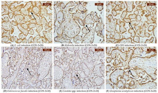 The tissue samples from all the pregnant women in this study, including those with vaginal infections and the control group, exhibited similarly intense positivity for COX-2. Thus, based on our study findings, this molecule’s expression is more linked to inflammation rather than being infection-specific. The high levels observed in both groups can be explained by the fact that we collected placenta tissues from the control group whose pregnancies were close to the time of labor, showing increased COX-2 expression, with consequent prostaglandin production that initiated birth [51].