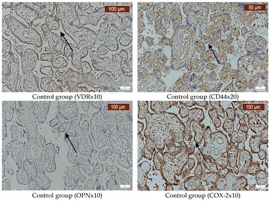We collected four tissue samples from each placenta, one for each of the quadrants. The samples were collected from the maternal side of the placenta, aiming to harvest a sample from the edge, one from the center, and the two remaining samples at equal distances between the periphery and the center to ensure better coverage. The hematoxylin and eosin (H&E)-stained sections were examined by two independent pathologists with expertise in gynecological pathology. Differences were resolved through discussion and compromise until an agreement was reached. Immunohistochemistry (IHC) was performed and evaluated by two pathologists. IHC staining was performed on formalin-fixed, paraffin-embedded tissues, utilizing monoclonal antibodies against VDR, CD44, OPN, and COX-2. Four-micrometer-thick serial sections were prepared in citrate buffer (pH 6) after deparaffinization in xylene and rehydration in ethanol series. Endogenous peroxidase activity was inhibited with 0.3% H2O2 for 20 min at room temperature. IHC was performed to determine the expression of VDR, CD44, OPN, and anti-COX-2 using specific Abcam Company dilutions: for VDR, the dilution was 1:3000 (catalog no. ab3508, Abcam, Cambridge, UK); for CD44, it was 1:250 (catalog no. ab157107, Abcam, Cambridge, UK); for OPN, it was 1:200 (catalog no. ab8448, Abcam, Cambridge, UK); and for COX-2, it was 1:100 (catalog no. ab15191, Abcam, Cambridge, UK). The sections were incubated overnight at 4 °C. Then, the sections were washed, exposed to the secondary antibody for 45 min at 37 °C, and cleaned with phosphate-buffered saline (PBS). Hematoxylin was used as a counterstain with the standard avidin–biotin–peroxidase technique, using a liquid diaminobenzidine (DAB) substrate and a chromogen system. Human jejunum served as a positive control for VDR, CD44, OPN, and anti-COX-2 to ensure the specificity and sensitivity of the staining, validate the results, and rule out false positives or negatives. For the negative control, we treated the tissue samples in a way that should result in no staining, so the tissue samples would not express the antigen of interest.