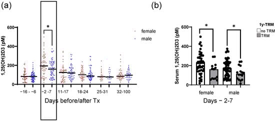 Time trend of 1,25-dihydroxyvitamin D3 serum levels in association with patient sex. Shown in (a) are the serum 1,25(OH)2D3 serum levels for female and male patients of the analyzed cohort, measured repeatedly at hospital admission (days −16 to −6); peri-transplant (days −2 to 7); during early weekly follow-up (days 11 to 17; 18 to 24; 25 to 31); and late follow-up (days 32 to 100 after HSCT). In (b), the 1,25(OH)2D3 serum levels are depicted for female and male patients with or without TRM. Median serum levels are depicted in bold. Statistical analysis was performed using the Mann–Whitney U test (* p ≤ 0.05).