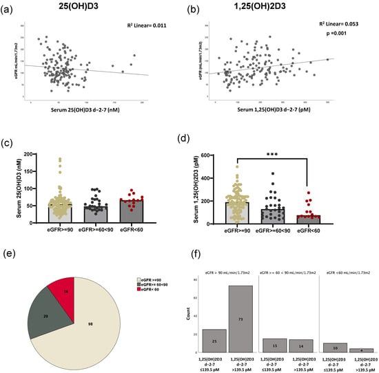 Correlation of eGFR and 25-hydroxyvitamin D3 and 1,25-dihydroxyvitamin D3 serum levels in HSCT patients. The correlation between eGFR values and 25(OH)D3 (a) and 1,25(OH)2D3 (b) in patient serum at peri-transplant is shown. (c) The level of 25(OH)D3 stratified accordingly to eGFR levels. (d) The level of 1,25(OH)2D3. (*** p ≤ 0.001; Bonferroni test). (e) The patient distribution according to eGFR values. (f) The number of patients below or above the 1,25(OH)2D3 cutoff of 139.5 pM, accordingly to eGFR stratification.