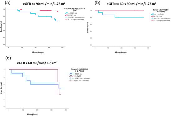 As observed in Figure 5a–c, high 1,25(OH)2D3 peri-transplant levels were related to lower one-year TRM in all eGFR categories, as we observed clearly separated Kaplan–Meier survival curves in all of the eGFR strata. However, due to the nature of the data distribution, only eGFRs above 90 were significantly different. (eGFR > 90 log-rank test p = 0.001; eGFR > 60 < 90 log-rank test p = 0.079; eGFR < 60 log-rank test p = 0.896).