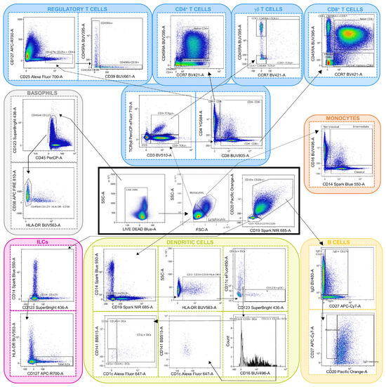 All the major immunological cell populations were accurately identified through manual gating and comprised CD4+, CD8+, and TCRγδ+ T lymphocytes; B lymphocytes; monocytes; dendritic cells; basophils; and innate lymphoid cells (Figure 1). Cell populations that needed the CD56 marker to be identified were excluded from the analysis due to technical issues relative to the expression of CD56 detected during the experiment.