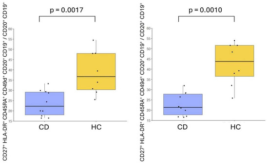 The differences between patients with CD and HC in CD20+ CD19+ were confirmed at both time points when the CD27+ CD45RA+ HLA-DR+ CD49d+ CD19+ CD20+ cell population was manually gated. The percentage of CD27+ CD45RA+ HLA-DR+ CD49d+ CD20+ CD19+ cells relative to the total CD20+ CD19+ cells was significantly lower in CD. At baseline, this percentage was 23.57 ± 1.99% in patients with CD vs. 38.64 ± 3.73% in HC (p = 0.0017), and on day 6, it was 22.8 ± 1.77% in patients with CD vs. 39.2 ± 4% in HC (p = 0.0010). These results are shown in Figure 4. This population corresponded to B lymphocytes with the memory phenotype (CD27+). A detailed examination of markers with variable expressions such as CD39, to evaluate activation or regulatory functions, or IgD, to classify into class-switched and non-class-switched memory B cells, did not provide additional insights to increase the differences between groups. Moreover, excluding the HLA-DR selection did not alter the results, as this marker is fully represented on B lymphocytes. No differences among the proportion of total B lymphocytes were found.
