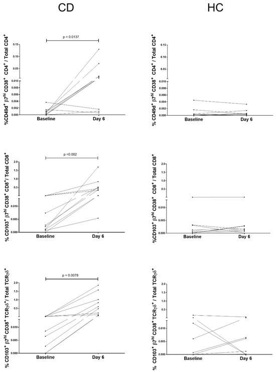 The markers used to identify these cell populations in peripheral blood were previously defined as β7hi CD103+ CD38+ for CD8+ and TCRγδ+ T cells [2,3,5], and we used β7+ CD49d+ CD38+ for CD4+ T cells [18]. Using these gating strategies, we confirmed significant differences. The percentage of β7+ CD103+ CD38+ CD8+ T cells relative to the total CD8+ T cell population was significantly higher on day 6 compared to baseline in patients with CD (p = 0.002), as well as when comparing CD and HC participants on day 6 (p < 0.0001). Identical patterns were observed in β7+ CD103+ CD38+ TCRγδ+ and β7+ CD49d+ CD38+ CD4+ T cells: baseline vs. day 6 in patients with CD (p = 0.009 and p = 0.0137, respectively), as well as between patients with CD and HC on day 6 (p < 0.0001 and p = 0.001, respectively). While all T cell subsets exhibited an increase in the percentage of activated gut-homing T cells, this effect was most pronounced in the CD8⁺ and TCRγδ + subsets (Figure 6).