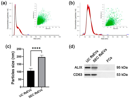 Characterization of small extracellular vesicles from follicular fluid (ffsEVs). (a) Size distribution, where black lines represent the mean particle distribution and the red areas indicate the standard deviation (SD), and intensity, where each green dot represents an event quantified by its size and intensity, of small extracellular vesicles isolated by ultracentrifugation (UC) and (b) size-exclusion chromatography (SEC). (c) Statistical comparison using Student’s t-test of particle sizes obtained through ultracentrifugation (UC ffsEVs) (106.801 ± 11.331 nm) and size-exclusion chromatography (SEC ffsEVs) (196.775 ± 9.368 nm). Significant differences are indicated by asterisks (**** = p < 0.0001). (d) Western blot of proteins obtained from UC ffsEVs, SEC ffsEVs, and follicular cells (FCs). The small extracellular vesicle markers ALIX and CD63 were positive in both ffsEVs samples and negative in FCs.