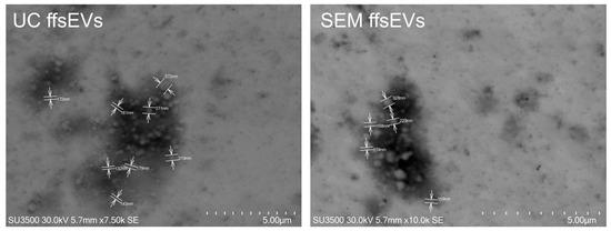 For microscopy analysis, samples were diluted 1:250 in 4% (v/v) glutaraldehyde (Sigma-Aldrich, Burlington, MA, USA). Subsequently, a 5 μL droplet of the solution was applied to a carbon/formvar-coated copper grid with a 200-mesh size and incubated at room temperature for 10 min. Images were acquired using a SU3500 scanning electron microscope (Hitachi, Tokyo, Japan) with an acceleration voltage of 30 kV.