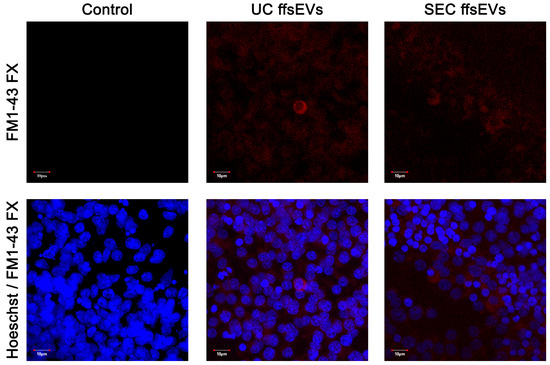 Confocal microscopy analysis of small extracellular vesicles from follicular fluid isolated by ultracentrifugation (UC ffEVs) and size-exclusion chromatography (SEC ffsEVs) and stained with FM1-43 FM (red). The nuclei of cumulus cells were labeled with Hoechst stain (blue). Scale bar: 10 µm.