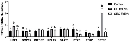 Effect of ffsEVs, isolated by ultracentrifugation (UC ffsEVs) and size-exclusion chromatography (SEC ffsEVs), supplementation in maturation media on the relative expression levels of bovine oocytes matured in vitro. The relative mRNA expressions of the genes HSF1, BMP15, IGFBP2, RPL15, STAT3, PTX3, PFKP, and CPT1B were obtained via RT-qPCR analysis, comparing the values 2(−ΔΔCt) using analysis of variance (ANOVA). The results were normalized using the reference genes HPRT1 and GAPDH expression levels. Statistically significant differences are indicated by groups of letters (a,b), where each letter represents a statistically homogeneous group, different letters indicate significant differences, and p < 0.05. Data are represented from 3 biological samples, each consisting of 30 mature oocytes.