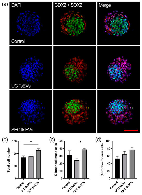 (a) Representative images of differential staining of blastocysts (n = 8) obtained from the Control oocytes and those treated with UC- and SEC-isolated ffsEVs and fertilized in vitro (IVF). The total cell number was evaluated using DAPI staining (blue); inner cell mass (ICM) cells were assessed by SOX2 immunostaining (green), and trophectoderm (TE) cells were evaluated by CDX2 immunostaining (red). The scale bar is the following: 100 µm. (b) The quantification of the total cells in blastocysts derived from the Control and UC- and SEC-FF-EV-treated oocytes and fertilized in vitro (IVF). (c) Percentage of ICM cells relative to the total number of cells. (d) Percentage of TE cells relative to the total number of cells. Statistical differences were determined by analysis of variance (ANOVA). *: p < 0.05.