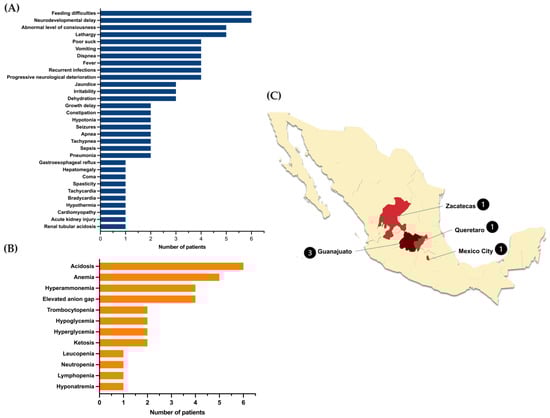 Clinical (A) and biochemical characteristics (B) of the MUTd patients homozygous for the NM_000255.4:c.322C>T or p.(Arg108Cys) variant and geographical distribution of the families in Mexico. (C) The numbers in a circle indicate the cases in each location.