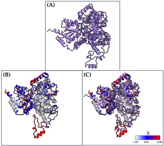 Molecular dynamics revealed significant changes in the MUT tertiary structure, particularly in the catalytic domain. We show the monomer of Wt MUT (Figure 2A) and the NM_000255.4:c.322C>T or p.(Arg108Cys) variant (Figure 2B) after MDS. Both structures are aligned based on their 3D conformation, with differences evaluated using the RMSD of the main chain alpha carbons (Figure 2C). A color-coded guide is provided to compare the degree of deviation from the native structural arrangement in the mutant protein.