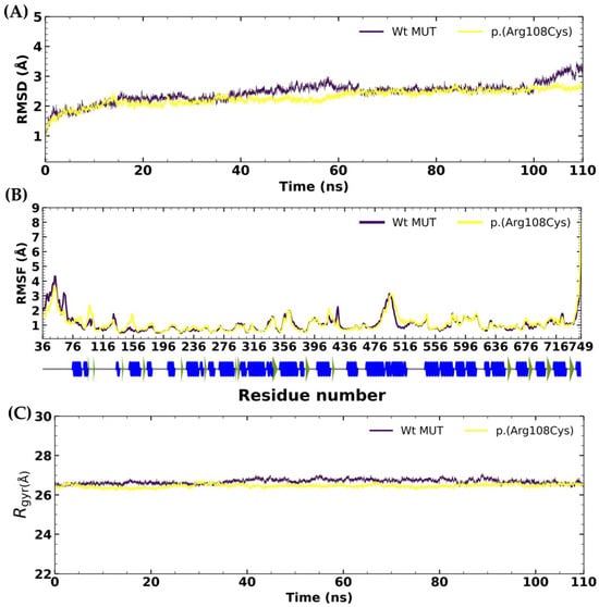 Root mean square deviation (RMSD), (A) root mean square fluctuation (RMSF) (B), and radius of gyrus (Rgyr) (C) plots of the Wt MUT and p.(Arg108Cys) variant of methylmalonyl-CoA mutase. The figures represent the average values of three MDS replicates. For the Wt MUT, the mean RMSD was 2.44 ± 0.32 Å, the mean RMSF was 1.08 ± 0.63 Å, and the mean Rgyr was 22.98 Å ± 0.10. For the p.(Arg108Cys) variant, the mean RMSD was 2.28 ± 0.26 Å, the mean RMSF was 1.10 ± 0.60 Å, and the mean Rgyr was 22.79 Å ± 0.07.