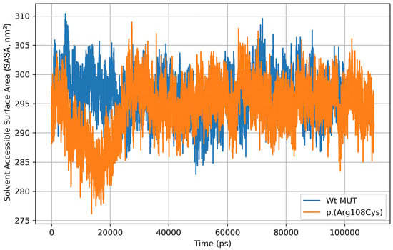 Solvent-accessible surface area (SASA) during the MD simulation of the Wt MUT and p.(Arg108Cys) variant. The graph represents the mean ± standard deviation of SASA for Wt MUT (296.20 ± 3.60 nm2) and for the p.(Arg108Cys) variant (294.25 ± 4.54 nm2) from three MDS replicates.