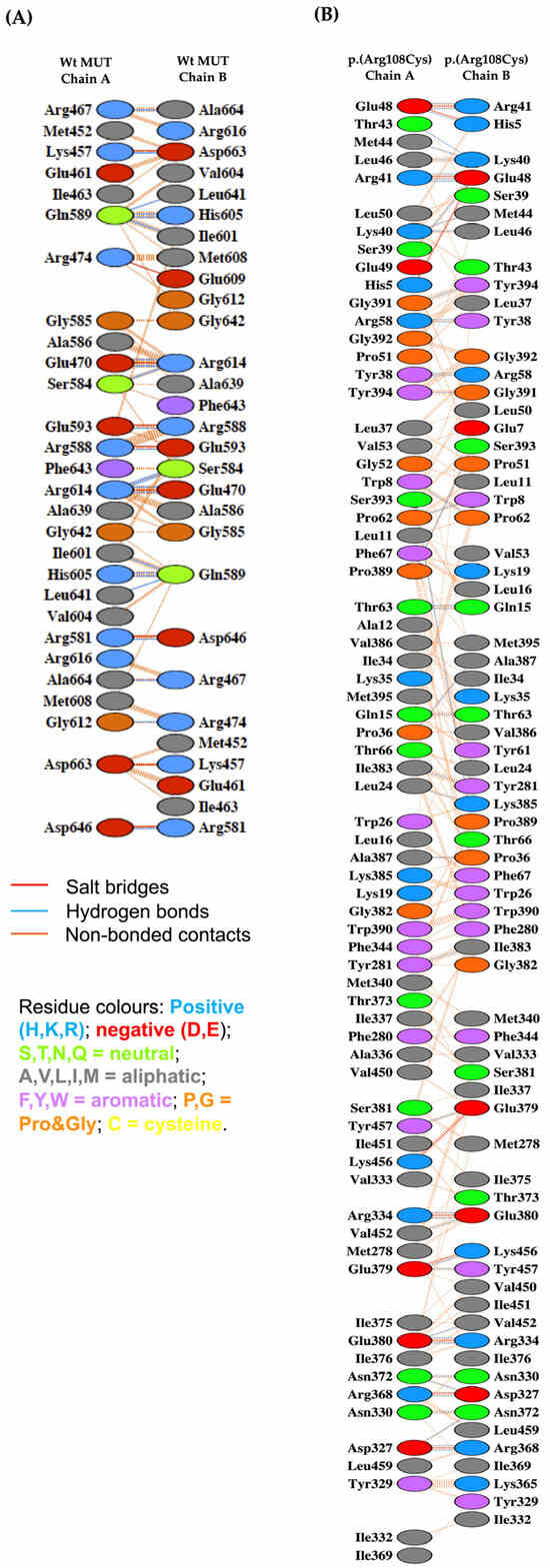 Interface amino acid interactions of the Wt MUT homodimer vs. NM_000255.4:c.322C>T or p.(Arg108Cys) homodimer. (A) Amino acids that constitute the interface between two Wt MUT monomers. (B) Amino acids that constitute the interface between two NM_000255.4:c.322C>T or p.(Arg108Cys) variant monomers.
