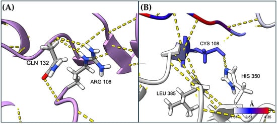 The local changes surrounding the mutation site were analyzed, focusing on hydrogen bonds and other important parameters. We found that the mutation disrupted key interactions, such as hydrogen bonds, i.e., the Arg 108 residue usually forms bonds with Gln132, while Cys at position 108 interacts with His350 and Leu385 (Figure 6).