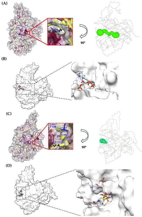 Differences in the cavity volume between Wt MUT and NM_000255.4:c.322C>T or p.(Arg108Cys) variant. The volume of the cavity of Wt MUT (A) is the smallest and shows the deepest tunnel (green-colored, right side), where the substrate is adequately bound. (B) The cavity of the p.(Arg108Cys) variant shows the largest volume (C) with a shortened tunnel (green-colored, right side), causing an aberrant accommodation of the substrate (D). The close-ups highlight the depth of the pockets and the disposition of the residue 108. MDS frames from the last 105–110 ns were used for the cavity analysis.