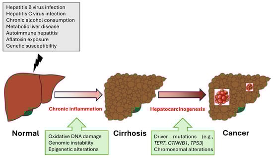 Mechanisms of hepatocarcinogenesis from chronic liver disease to cancer. The progression from normal liver to cirrhosis and HCC is driven by chronic liver injury. HBV and HCV infections, chronic alcohol consumption, metabolic dysfunction-associated steatotic liver disease (MASLD), autoimmune hepatitis, aflatoxin exposure, and genetic susceptibility contribute to persistent inflammation, fibrosis, and cirrhosis. Chronic inflammatory processes induce oxidative DNA damage, genomic instability, and epigenetic alterations, leading to the accumulation of key driver mutations (e.g., TERT, CTNNB1, and TP53) and chromosomal aberrations. These molecular changes facilitate hepatocyte transformation, uncontrolled proliferation, and malignant progression, ultimately resulting in HCC.