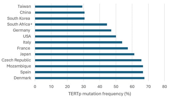 Frequency of TERT promoter mutations in HCC cases across different geographic regions. *: Combined data from South Africa, Swaziland, Lesotho, and Transkei.