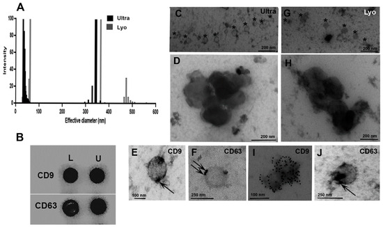 Analysis of vesicles from saliva under different isolation conditions. (A) QELS analysis of vesicles in suspension comparing ultracentrifugation (black column) and lyophilization (gray column) methods, with particle distribution analyzed at higher intensities. Vesicles from the ultracentrifugation method are divided into two size populations (30–50 nm and 320–360 nm), while those from lyophilization are categorized into three populations (50–70 nm, 360–380 nm, and 470–510 nm). (B) Dot blotting analysis using 25 µg of protein per well. Immunolocalization of specific EV proteins was evaluated using the indicated antibodies. (C–F) EVs from ultracentrifugation and (G–J) from lyophilization procedures. Micrographs display several EVs of varying sizes, sometimes appearing to adhere to one another. (C,G) The subpopulation of small EVs is marked by an asterisk line. (D,H) Larger EVs from Ultra or Lyo fractions, respectively. (E,F,I,J) The arrows indicate the immunolocalization of CD9 or CD63 markers in isolated EVs via electron microscopy. Notable CD9 localization is observed in the Lyo fraction in the image (I)—legend: Ultra—ultracentrifugation; Lyo—lyophilization.
