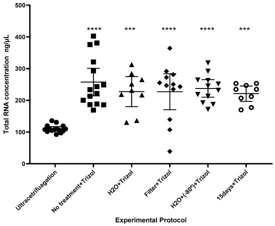 Effect of experimental protocol on the amount of total RNA (ng/µL) recovered. Data are expressed as mean and 95% confidence interval (vertical bars). The statistical significance related to ultracentrifugation protocol: p < 0.001 (***) and p < 0.0001 (****). (Samples were collected from participants 1, 2, and 3) (ANOVA with Tukey post hoc).