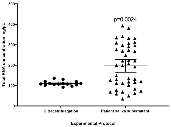 A total of 44 patient samples were collected, lyophilized, and isolated by the Trizol method to assess the lyophilization process on many samples and analyze the amount of total RNA (ng/µL) recovered compared to the ultracentrifugation group. A statistical difference was observed between the ultracentrifugation group and the Lyophilized Patient Supernatant (p = 0.0024) (Figure 3).